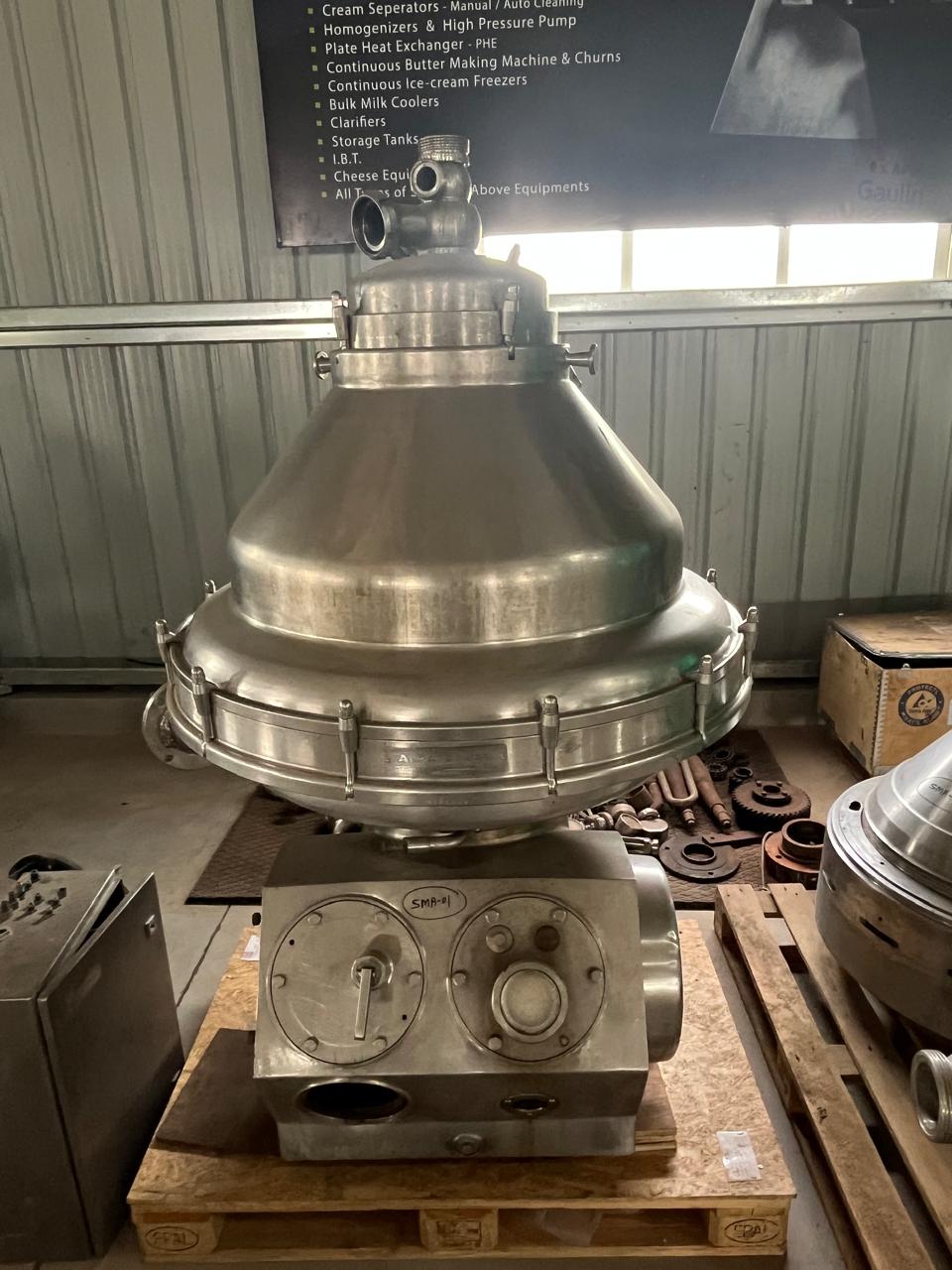 This is a Used / Pre – Owned ALFA LAVAL MRPX 410TGV Cream Separator with 8000 LPH capacity and Bowl Speed RPM 6240. Includes plates and bowls. Made in Sweden. Currently held at Shrinivasa Techno Facility.